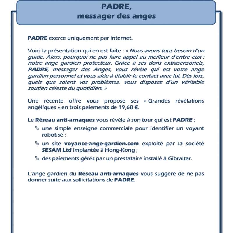 Lisez les témoignages des personnes qui lui ont fait confiance et découvrez vous aussi qui est votre Ange Gardien !. 5% De Rabais Sur Toute Commande Avec Code Promotionnel Padre;. Padre ange gardien Url / Site internet wwwvoyanceangegardiencom Score fiabilité Scamdoc Info Contact / Whois Contenu de l'arnaque Message de Padre ange gardien Vous recevez un lien dans un email et si vous avez le malheur de cliquer dessus par curiosité, il semble que le lien est un liien phishing.