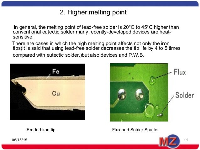 Rosin core solder is ideal for low temperature electronics soldering;. Kester Solder Alloys ALLOY Melting Range °C Melting Range °F PASTE WIRE PREFORMS BAR HIGHTEMP Pb100 327 621 X Sn1Pb975Ag15 309 5 X X X. 2 Higher melting point In general, the melting point of leadfree solder is ℃ to 45℃ higher than conventional eutectic solder (A popular type contains approximately 40% lead) Assume, for example, that a soldering iron is set to a temperature of 340℃ to use eutectic solder (SnPb).