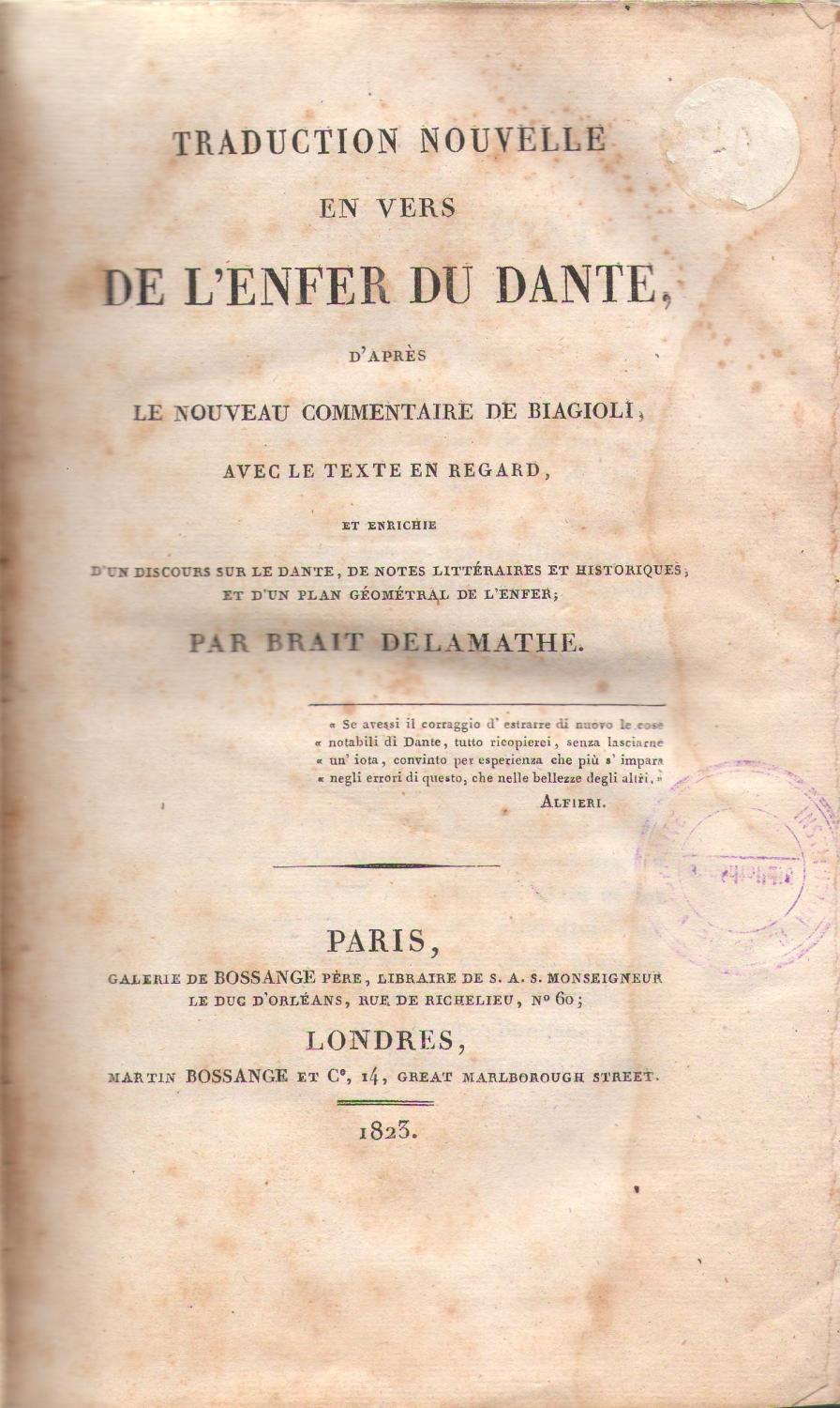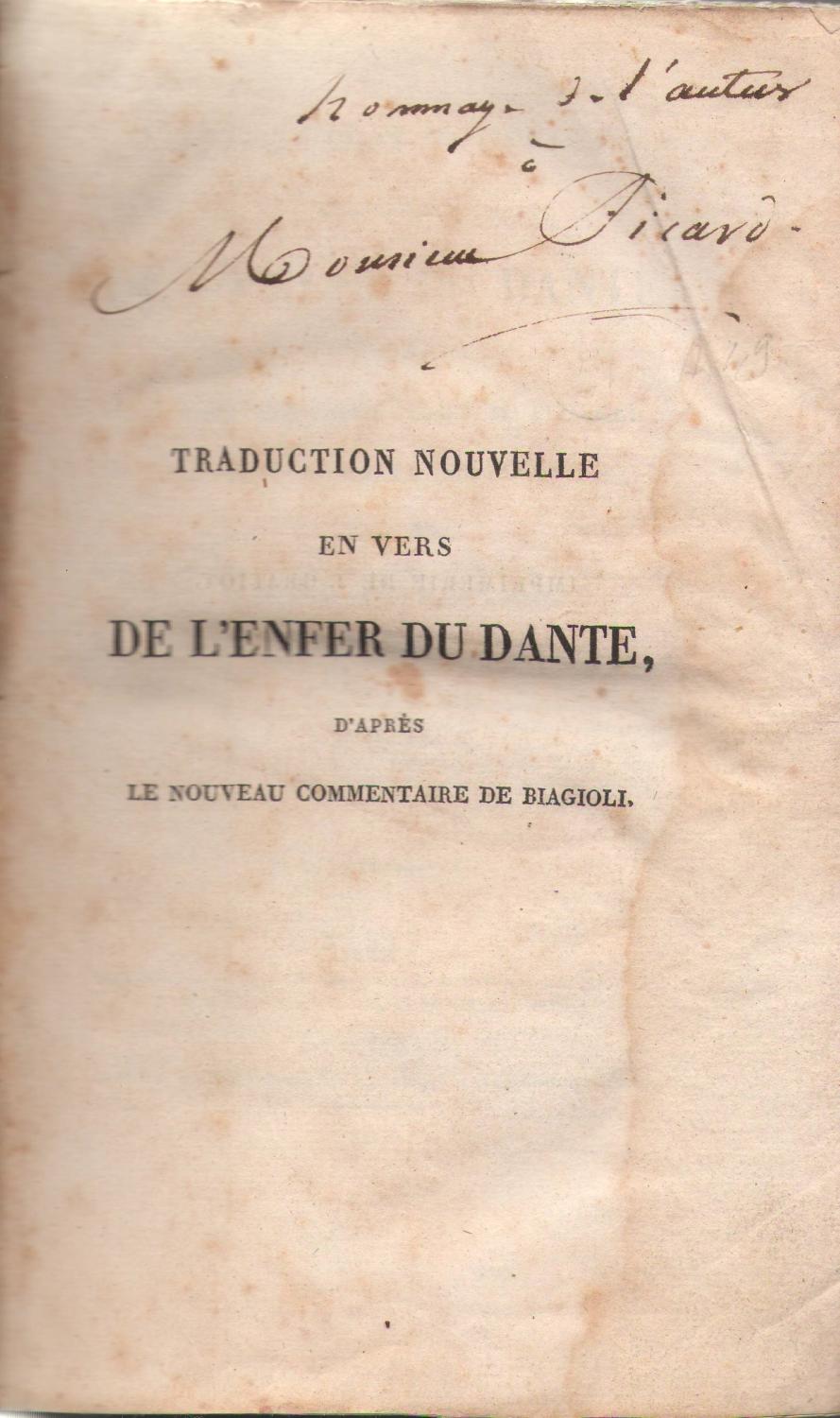 Traduction Nouvelle En Vers De L Enfer Du Dante D Apres Le Nouveau Commentaire De Biagioli Avec Le Texte En Regard Et Enrichie D Un Discours Sur Le Dante Par Brait Delamathe Copy Signed