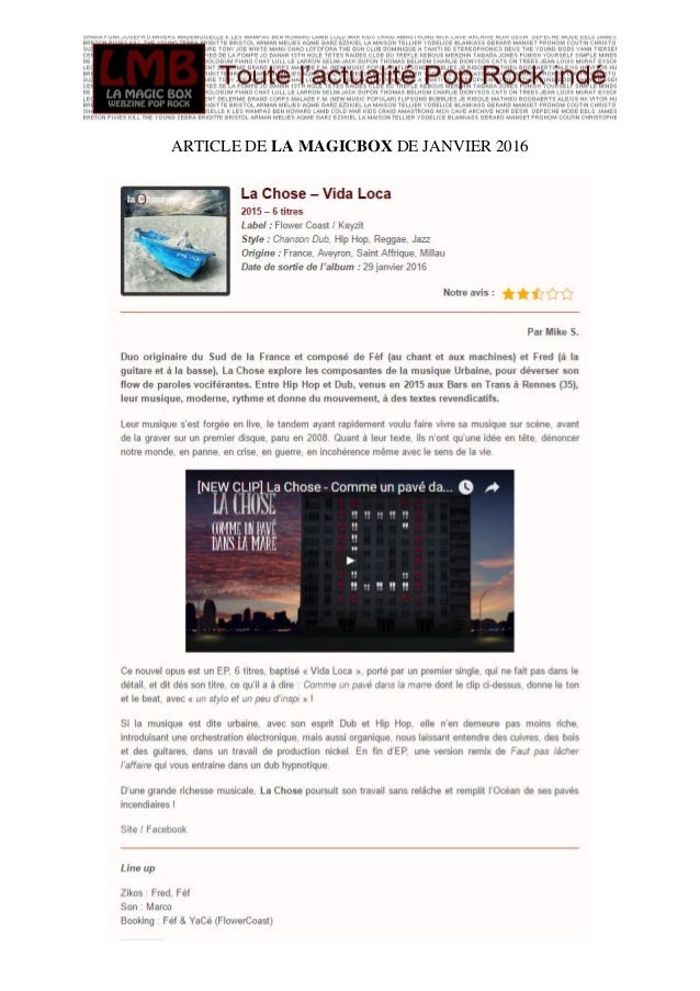 Le visuel de la « Vida Loca » ne s'éloigne pas du thème de ses paroles Le clip s'ouvre sur un William en bigboss qui saute en un claquement de doigt d'une ambiance de travail à une fête déchaînée dans les bureaux. Paroles et traduction de la chanson «VIDA LOCA (Ft Nicki Jam & Tyga)» par The Black Eyed Peas Vida loca y no e' la de Ricky (Ah) La vie de dingue, ce n'est pas celle de Ricky Con una canción y me busco el ticket Avec une chanson puis je m'achète le billet Dinero, 'tamo pa' eso (Ah). All rights to their respective owners.