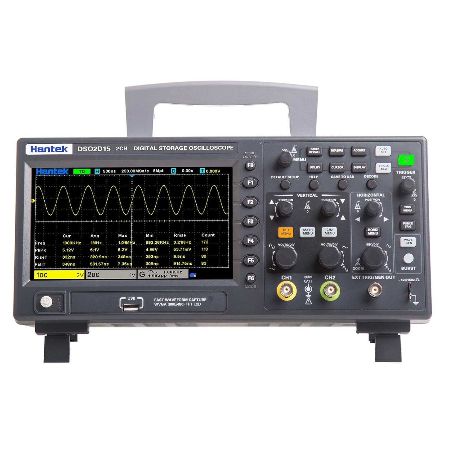 Hantek Dso2d15 Digital Storage Oscilloscope 150mhz 1gsa S 8m 2 Channel 2ch 1ch With Signal Source Amazon Com Industrial Scientific