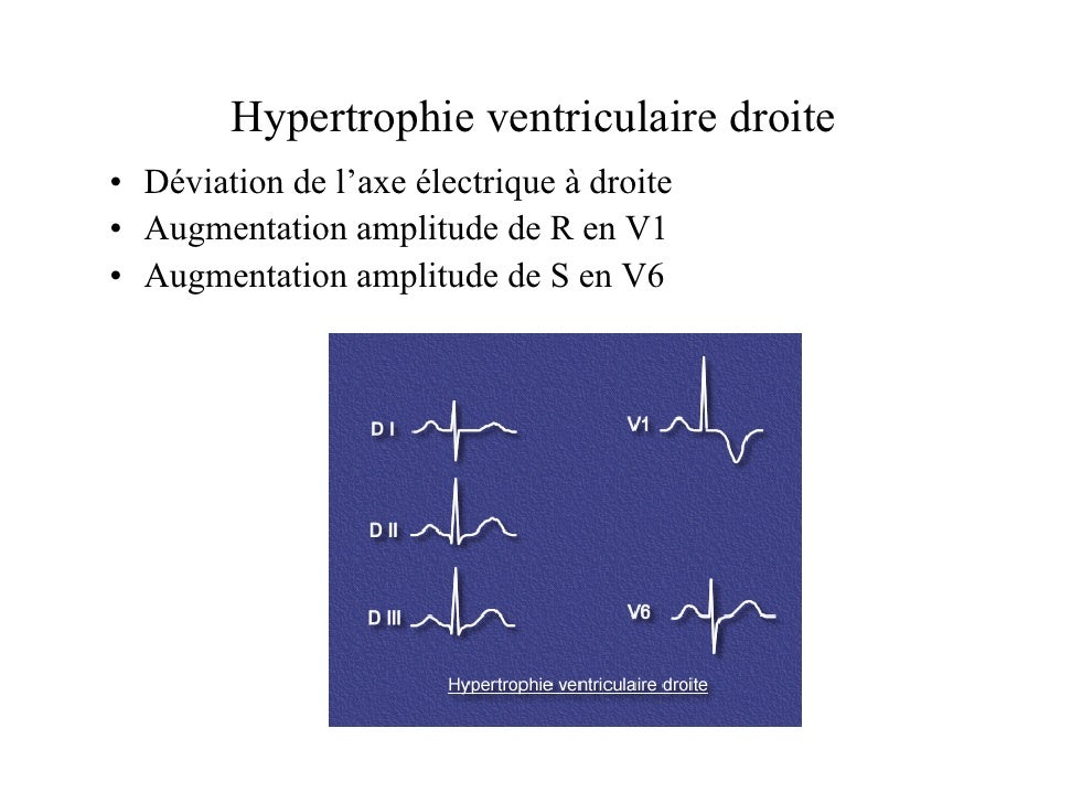 L’hypertrophie ventriculaire droite s’exprime sur l’électrocardiogramme en limitant la prépondérance des forces ventriculaires gauches ou en inversant le rapport L’hypertrophie ventriculaire droite s’associe souvent à une rotation dans le sens horaire du ventricule droit qui devient antérieur, le ventricule gauche étant refoulé en arrière.
